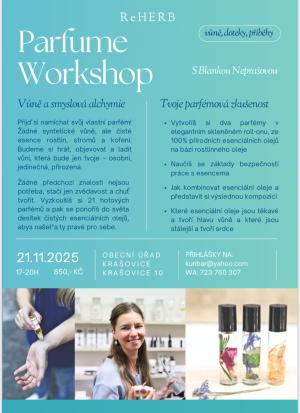 Srdečně Vás zveme na úžasný workshop na výrobu vlastních parfémů do budovy Obecního úřadu v Krašovicích č.p.49, lze možnost nakoupit i přírodní kosmetiku.
