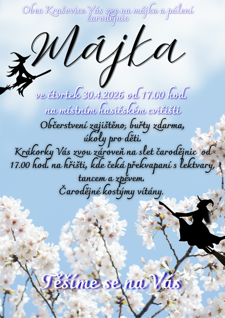 Obec Krašovice zve na májku a pálení čarodějnic, které se koná ve čtvrtek 30. dubna 2026. Akce začne v 17:00 na místním hasičském cvičišti. Na hřišti čeká překvapení s lektvary, tancem a zpěvem. Čarodějné kostýmy jsou vítány. Občerstvení je zajištěno a buřty budou zdarma. Těšíme se na vaši účast a na společné zážitky.