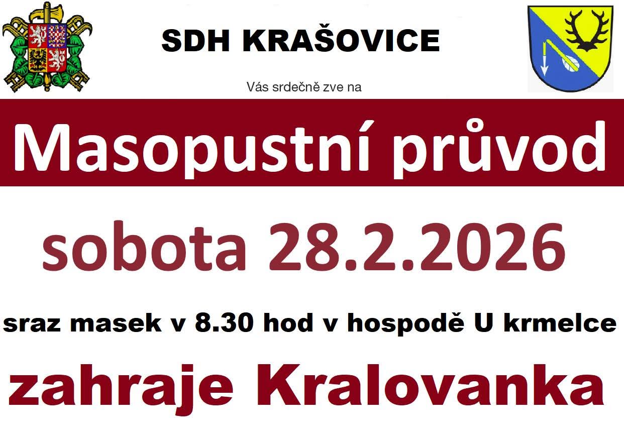 Zveme vás na masopustní průvod, který se uskuteční v sobotu 28. února 2026. Sraz masek je plánován na 8:30 hodin v hospodě U Krmelce. Během akce vystoupí hudební skupina Kralovanka, která přispěje k veselému průběhu celé akce. Přijďte se pobavit a užít si tuto tradiční událost.